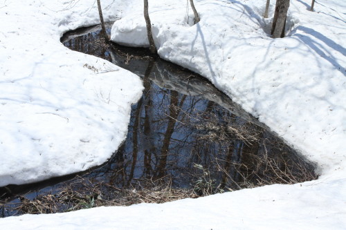 引き続き暖かな日が続いています。と言っても桜が咲くにはまだまだ程遠く、雪はスキー場にはタップリ有りますし、ペンション周辺でも、道路以外にはドッサリ有るのですが、雪に覆われていた湿地帯では水の流れがところどころに見え初めました。春めいた雪景色ですネ。