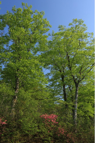 ダケカンバの新緑にミツバツツジのピンクもよく映えますが、今年の異常気温のせいか花の命は短かったですネ。アットいう間に咲いてアットいう間に終わりましたナ。今年は「花の命は短くて」が多いですネ。