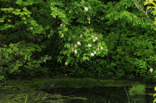 今年も、森の中の水辺の木の枝に、丸い餅がぶら下がった様になっているのが見かけられます。梅雨に入りモリアオガエルが水辺の木の枝に卵を産みつけたのですネ。
