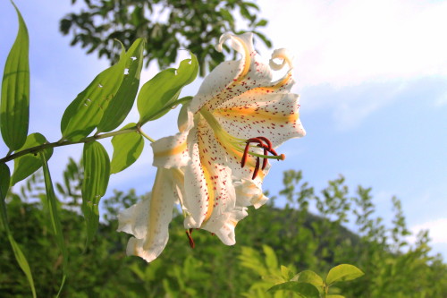 裏磐梯も梅雨が明けました。都会の様な熱射ではありませんが、山百合も陽射しに輝いておりました。白い花が梅雨明けの明るい緑に一層映えますネ。 これから夏の花々が輝く季節ですナ。屋外で過ごすのが気持ちの良い裏磐梯ですゾ!。