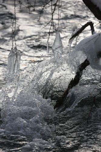 川の流れに抗うように一本の枝が垂れ下がっておりました。その枝に水が激しく当たり水しぶきが上がります。水しぶきの当たった枝には洋服の襟の様に、垂れ下がった蔓にはイカがぶら下がった様に氷ができておりました。「しぶき氷」は猪苗代湖の波しぶきが当たってできる氷ですが、この氷は一体何氷というのでありましょうか。「あらがい氷」とでもいうのでしょうかネ。