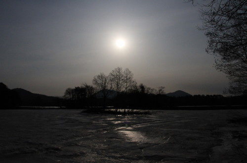 春の月に輝く残氷は冬の名残ですネ。空気も暖かく感じます。間もなくこの氷も融けててしまうことでしょうナ。