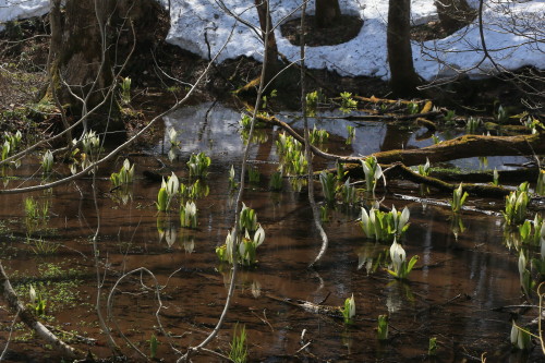 観光でお越しのお客様からは暖かだという声はあまり頂きませんが、地元の人間には暖かな心地よい陽射しが増えております。残雪が見る見るうちに溶けだし、あちこちで地面が露わになり、フキノトウやツクシや柳の新芽を沢山見かけるようになっております。水芭蕉も残雪の中、そこここで見られるようになってきました。
