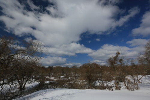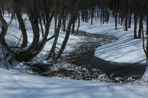 引き続き暖かな日が続いています。と言っても桜が咲くにはまだまだ程遠く、雪はスキー場にはタップリ有りますし、ペンション周辺でも、道路以外にはドッサリ有るのですが、雪に覆われていた湿地帯では水の流れがところどころに見え初めました。春めいた雪景色ですネ。