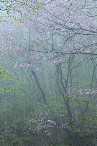 霧に覆われた風景は幽玄な風情が醸し出されるのですが、とりわけ桜の花が霧に覆われると花の派手さが、霧によってセーブされて、華やかな中にも落ち着きの有る風情になりますな。