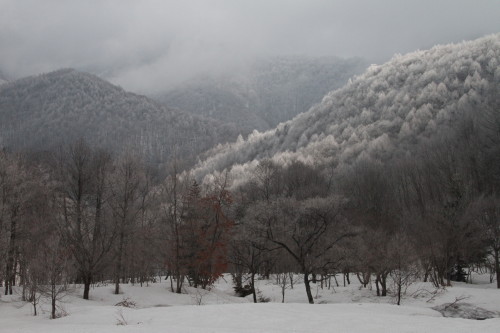 西の地方ではお花見が始まったとTVで報道されたので、暖かな日が続いていた裏磐梯にも、例年より早い勢いで、桜前線がやって来るのではないかと思っていたのですが、やはり「冬景色の聖地?」裏磐梯ではそう簡単に春はやっては来ませんナ。今朝は霧氷が出来るほどに冷えて、久しぶりに、冬景色の再来になりました。スキー場は鼻息荒くGWまで営業するとのことですヨ。春(桜の咲いている地方)と冬(吹雪いている地方)の間に在る裏磐梯はどちらになびくのかしら?