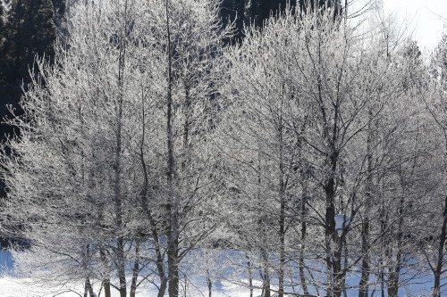 「降り続いた雪もカラリとはれて、高い空は二月晴。遠くの山の白壁が光り、続く雪原を風が渡る♪」等と歌いたくなる程に良い天気になりました。こんな冷え込んだ良い天気の日には、霧氷がきれいになります。他方、こんな日は水道管が破裂したり、車のバッテリーがあがってエンジンがかからなくなったり、等のトラブルも起こる様にもなります。美しい自然は、油断のならない存在でもありますヨ。