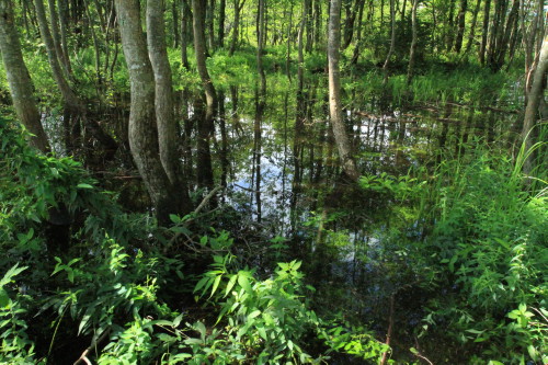 全国的によく降った雨は御多分にもれず裏磐梯でもよく降りました。水位の上昇した湖から川へは毎日放水されております。この雨で沼は池のようになり、湿地は沼のようになってしまいました。