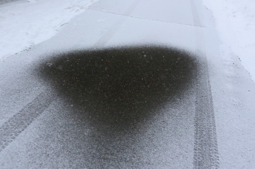 2014年2月14日15:58:08 道路にウッスラと雪が降り、その上を車が通って行きました。ふと見るとハートマークが出現しているではありませんか。なんでこんなものが見えるのか?。不思議でありましたが、この付近は温泉が出るので、ひょっとするとその一部が道路のアスファルトの下に沁みだし、その熱で雪を解かしアスファルトが見えているのかもしれません。雪が降らなくては見えず、雪が積もってしまうと見えなくなってしまうシロモノですナ。