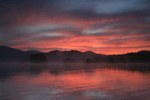 今朝は風がなかったので、少しですが靄もたなびいておりました。こんな日に限って誰もいないのでありますヨ。一人静かに朝焼け空を鑑賞させて頂きました。