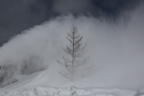 暖かな室内から窓ガラス越に、外の吹雪いた光景を撮影するのは、簡単でかつ快適です。しかし、吹雪いている戸外で吹雪を撮影するのは、並大抵ではありません。撮影ツアー日で吹雪いている時に、オーナーが撮影が無理だと言っても、撮影したいとお客様がいうと、撮影地へ御案内するのです。が、案の定、お客様はギブアップして、ペンションに帰りましょうと、おっしゃいます。吹雪をなめてはいけません。室内は快適でも、戸外は最悪なのですから。