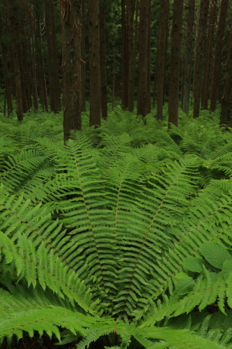 うっそうとした杉やカラマツなどの林の中にはオニのように大きなシダ類が密生しております。森や林のように日陰がないとシダ類は育たないからです。震災後、復興需要が旺盛なためか、杉林やカラマツ林の伐採が盛んになりましたので、あちこちのシダ類の群生が消え始めました。