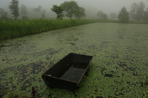 誰もいない 霧のジュンサイ沼も中々良い風情なのでありますヨ。ペンションレラの周辺ではジュンサイ摘みが始まりました。一度ご覧なさいナ。